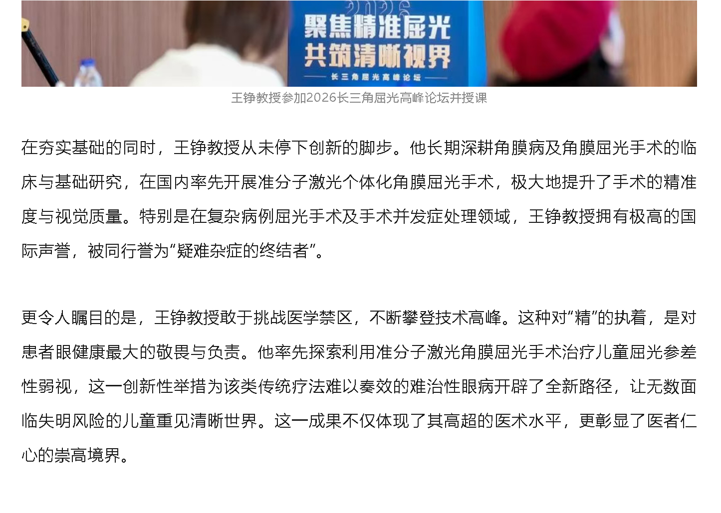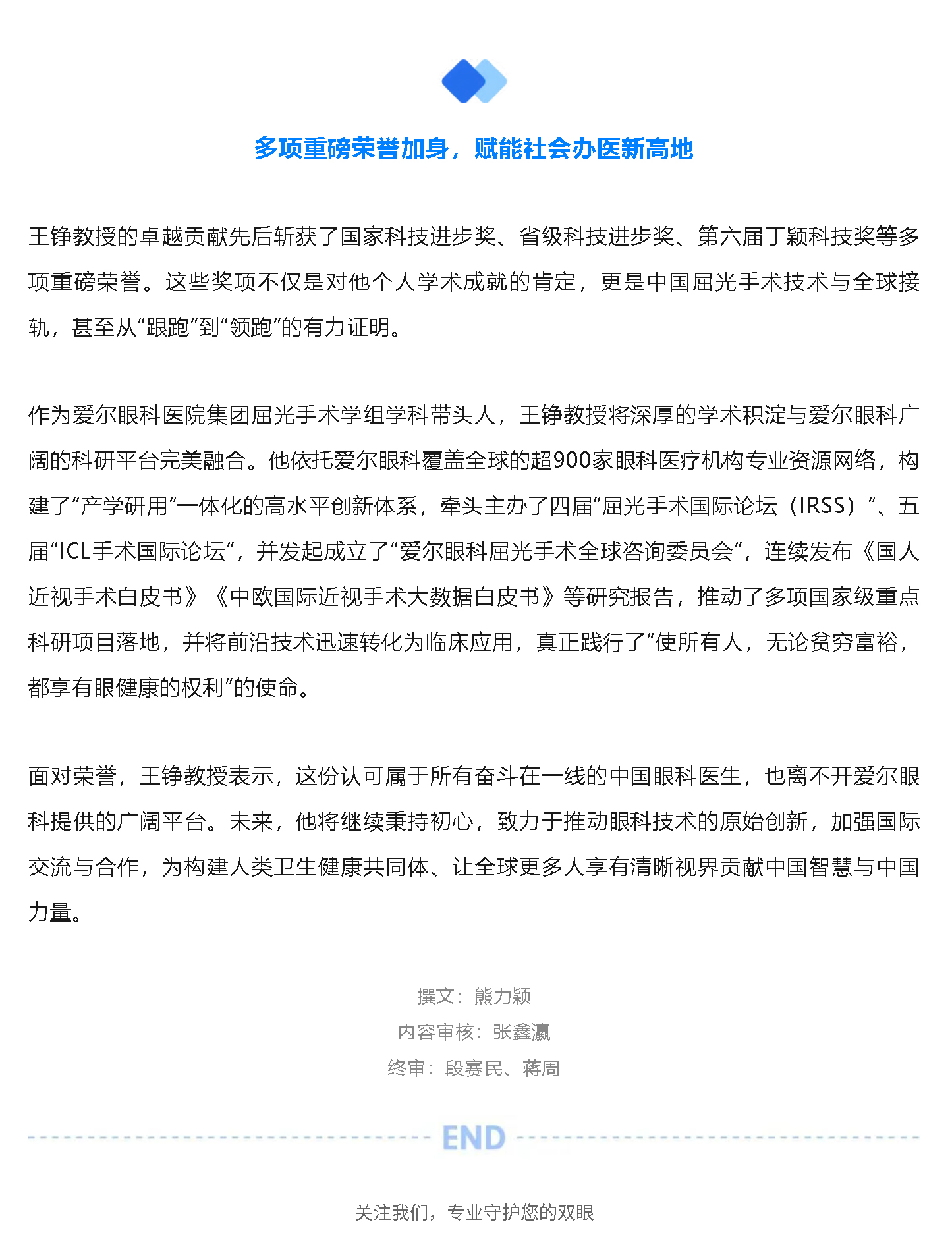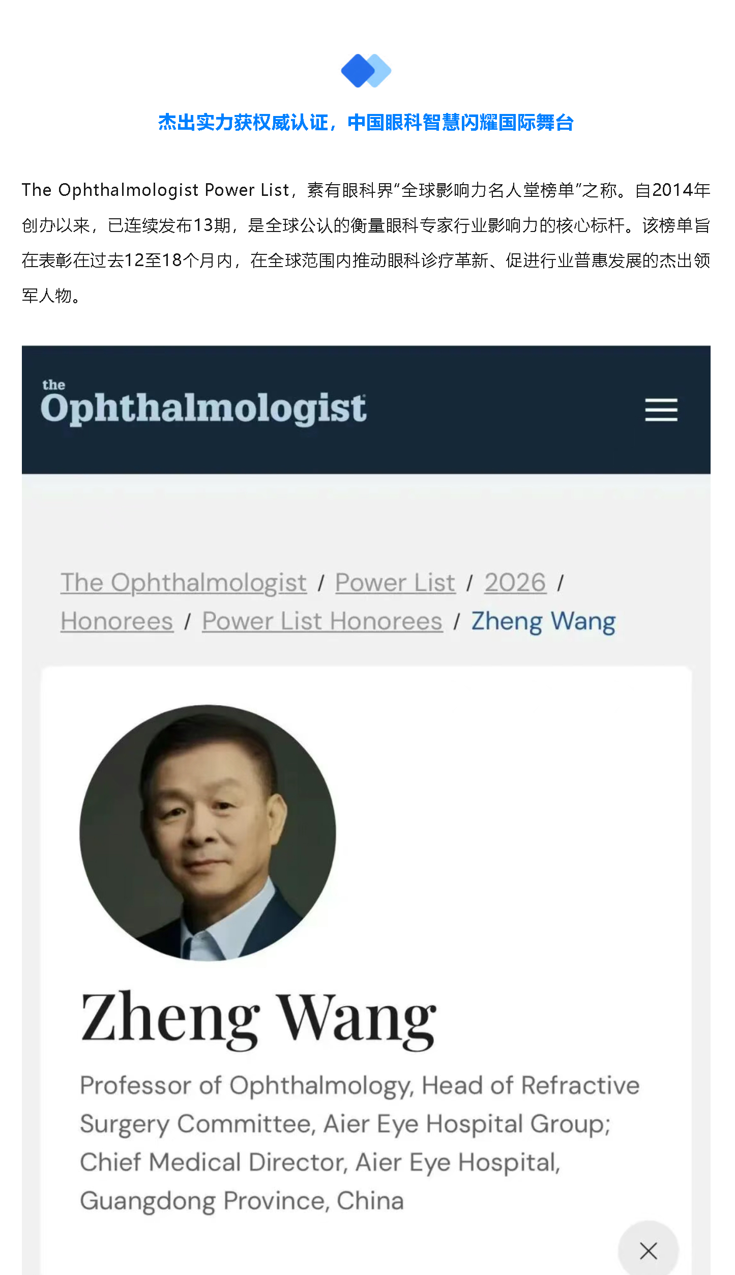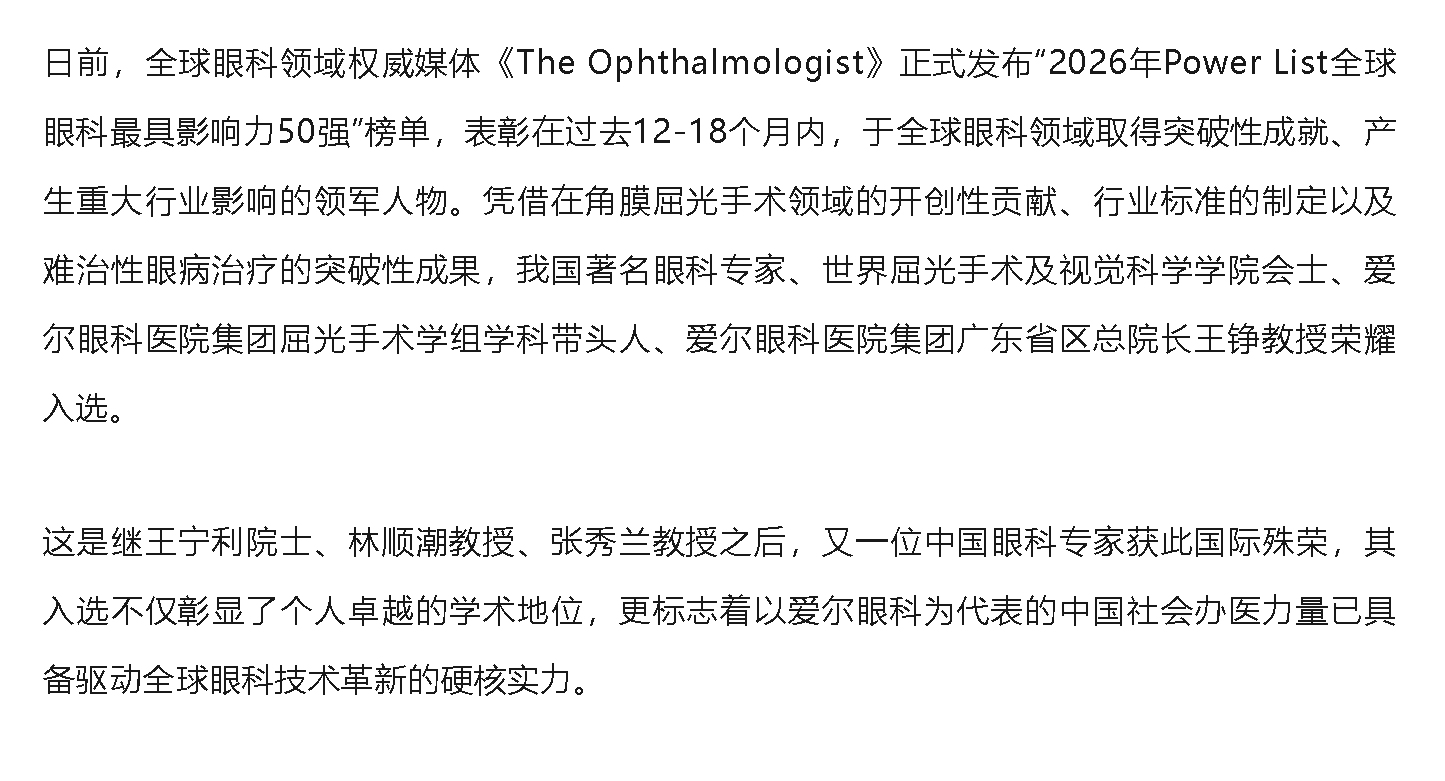 中国眼科再传捷报:爱尔眼科王铮教授入选2026年全球最具影响力眼科人物50强榜单
